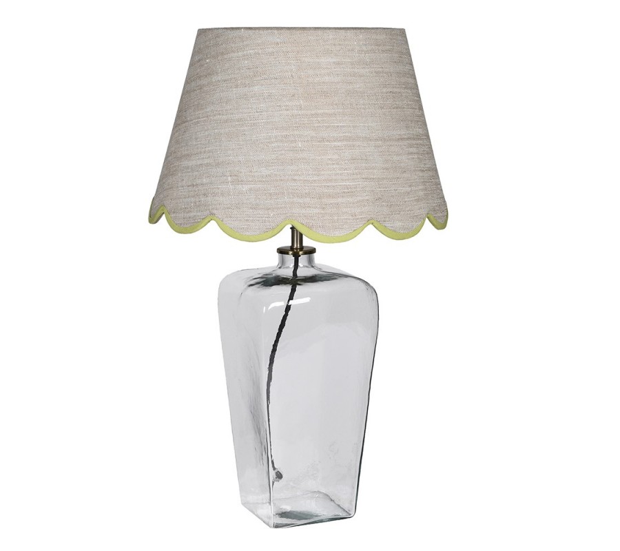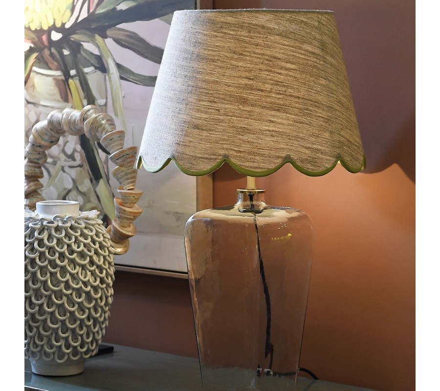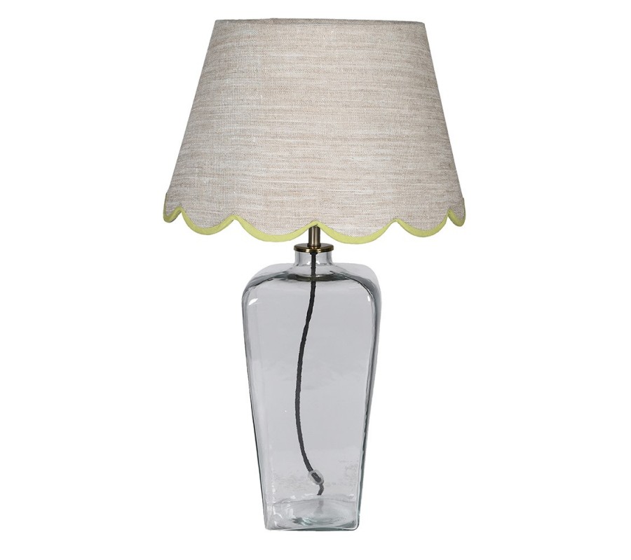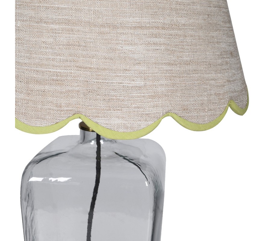 Jemná a stylová stolní lampa Bella Verde vyniká svým elegantním designem s nádechem přírodní svěžesti. Kombinuje hranatou průhlednou skleněnou nohu s lehkým béžovým stínítkem ze lnu, jehož spodní okraj je vlnkovitě vykrojený a lemovaný jemnou zelenou stuhou.Tento detail dodává lampě originální a hravý vzhled, který zjemňuje celkový dojem a působí.