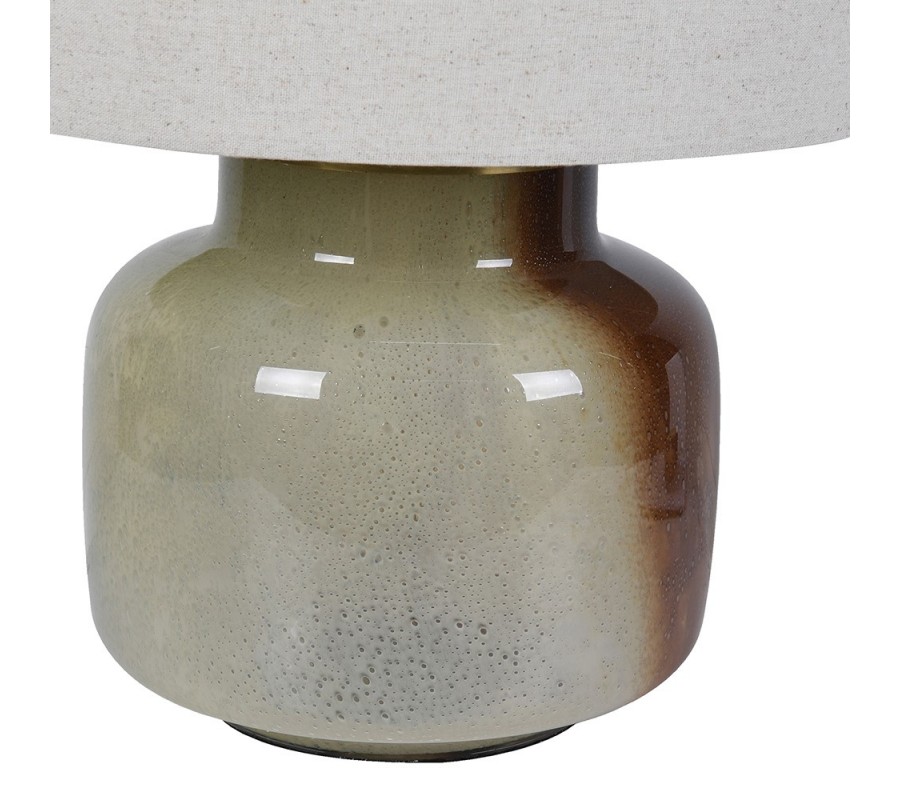 Moderní stolní lampa Terrza spojuje přirozené tóny země s jemným textilním povrchem. Válcové stínítko ze lněné tkaniny ve světle šedé barvě příjemně rozptyluje světlo, čímž vytváří měkký, hřejivý odstín a útulnou atmosféru. Pevná a odolná noha lampy z kvalitního plastu zaujme dvoubarevným designem – jedna polovina je šedá a druhá hnědá, přičemž povrch působí jako ručně tvarovaná hlína se zářivým glazurovým efektem. Tento kontrast barev a textur dodává lampě autentický a přirozený charakter.