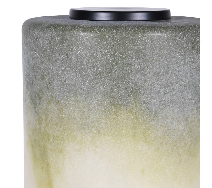 Moderní stolní lampa Spiral přináší do interiéru harmonickou hru barev a světla. Válcové stínítko z plastu plynule přechází od světlo krémové po tmavší zelenou, což vytváří jemný přeliv připomínající přirozený efekt mechu nebo kamene. Válcová noha ve stejném tónu elegantně navazuje na stínítko a působí jako jeho přirozené prodloužení. Lampa stojí na okrouhlé kovové podstavě v černé barvě s mramorovým efektem, která dodává stabilitu i vizuální kontrast.