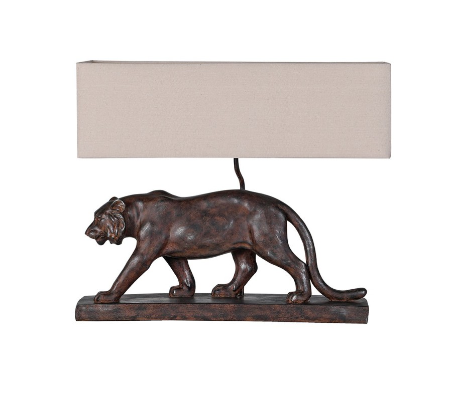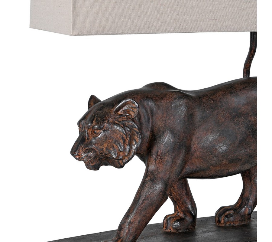 Dominantním prvkem lampy je podstava v obdélníkovém tvaru s detailně zpracovanou figurou lva v hnědém provedení. Lev je vyroben z pryskyřice a jeho povrchová úprava má vzhled starožitného, jemně patinovaného kovu, což podtrhuje majestátnost motivu a dodává lampě výrazný vintage charakter. Precizní tvarování zvýrazňuje sílu a dynamiku figury, zatímco robustní základna zajišťuje stabilitu a vizuální vyváženost celého designu.