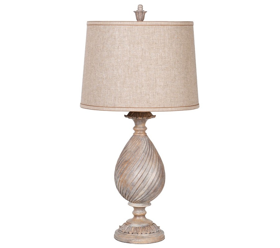 Noha je vyrobena z kombinace umělé pryskyřice a dýhy ve světlé béžové barvě s vintage patinovaným efektem, který zdůrazňuje vyřezávané detaily. Stínítko má jednoduchý válcovitý tvar s horizontálním prošíváním na vrchním a spodním lemu. Je vyrobeno ze lnu v naturálním béžovém odstínu a jeho konstrukce je ve vrchní části ukončena vyřezávanou finálou. Je potřebná žárovka typu E27 s maximálním příkonem 40 wattů.