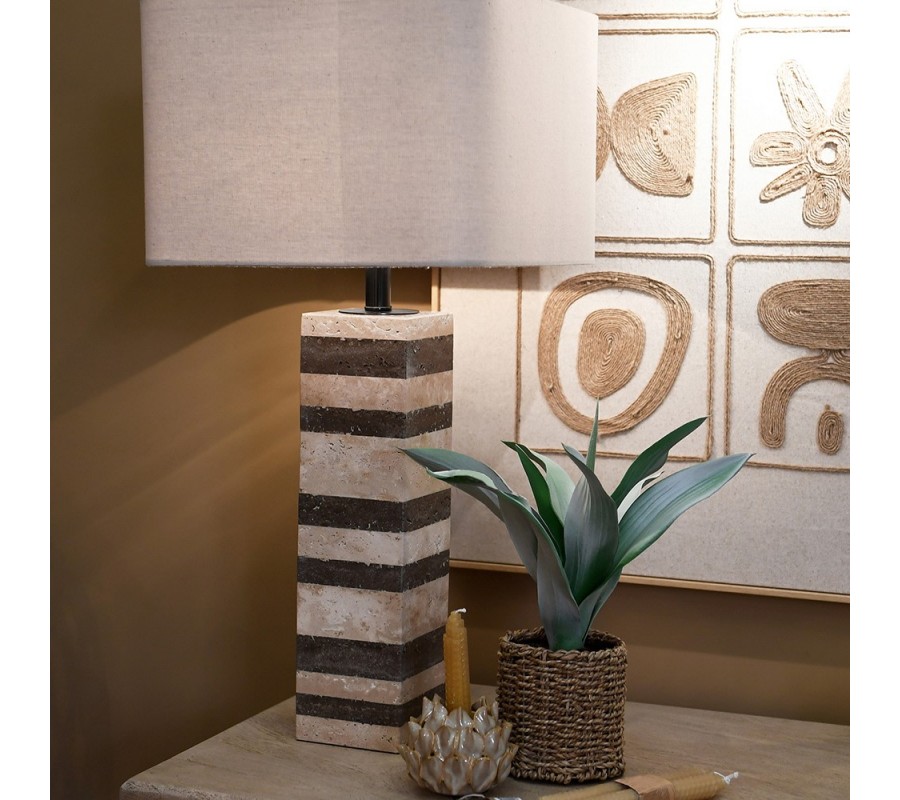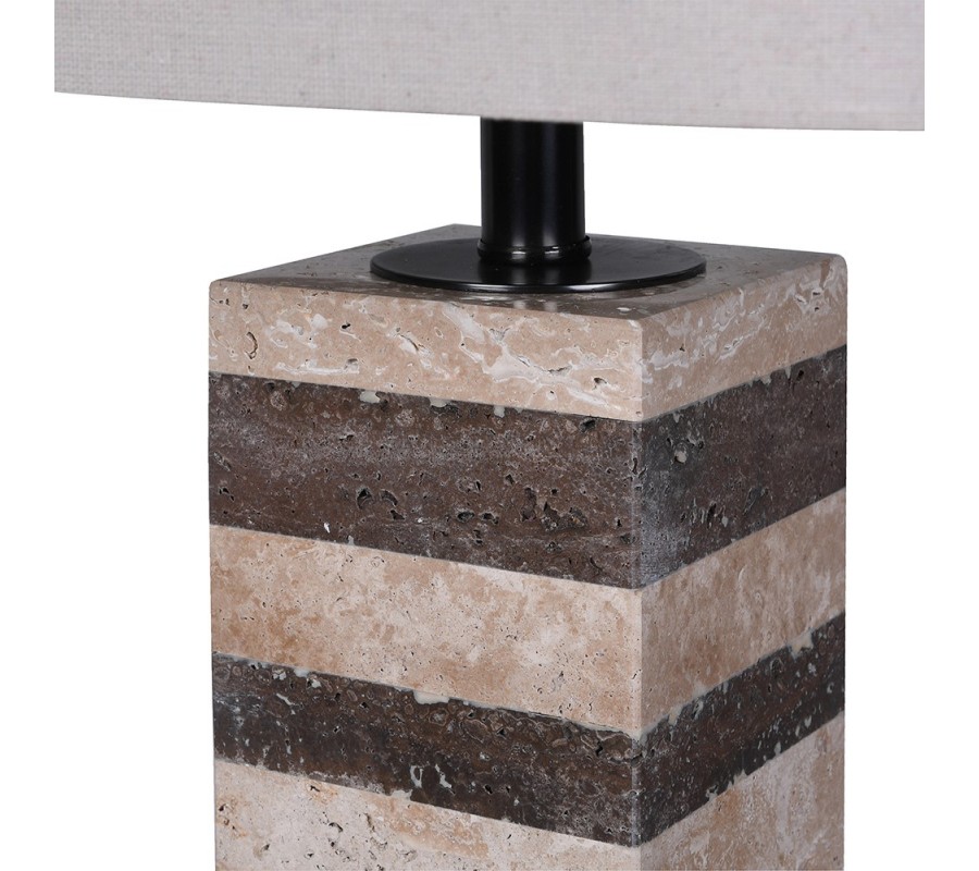 Designová moderní stolní lampa Cubbie s hranatým stínítkem a pruhovanou kamennou podstavou v hnědých a béžových tónech 72 cm