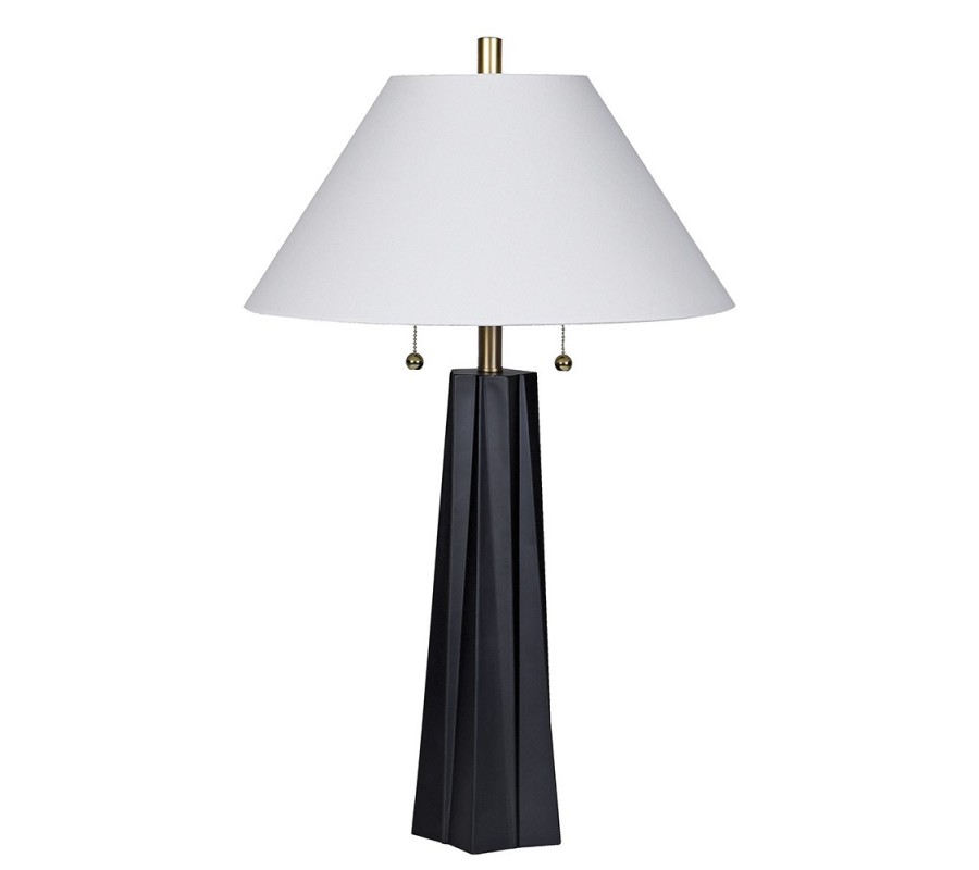 Lampe dominuje vysoká černá noha, která má dynamickou siluetu připomínající avantgardní sochařské dílo. Její tvar se směrem dolů jemně rozšiřuje a výrazný vertikální reliéf připomíná hranaté sloupy. Je vyrobena z akrylu, který jí poskytuje pevnou a stabilní základnu.