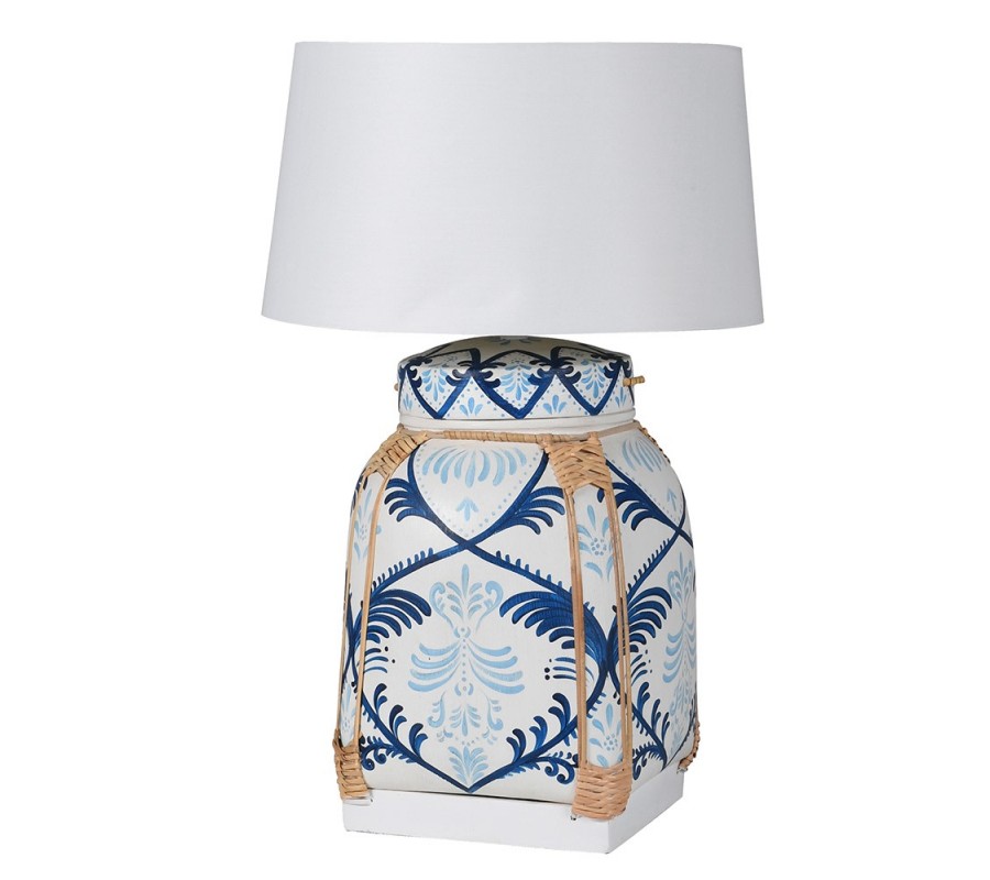 Jej čistou bílou barvu doplňuje ornamentální výzdoba s exotickým motivem. Vzory v odstínech světlejší a tmavě modré jsou ručně malované, což zaručuje originalitu každého kusu. Rohy nohy zdobí vypletaný detail v naturální světle hnědé barvě a ze stejného materiálu jsou vyrobeny i dekorativní úchyty na hrdle nádoby.