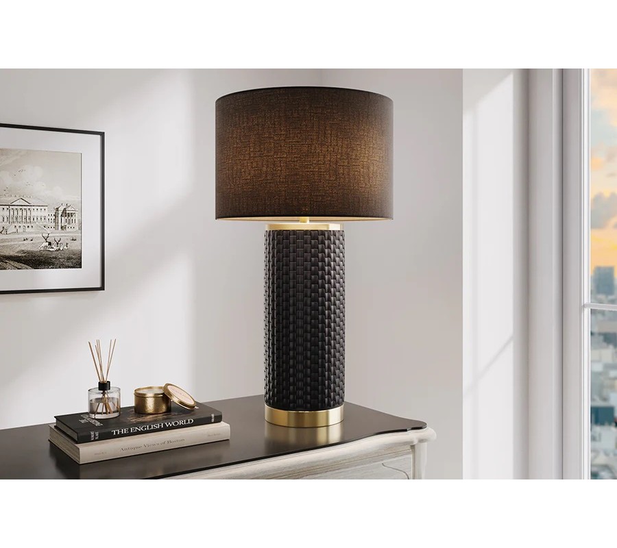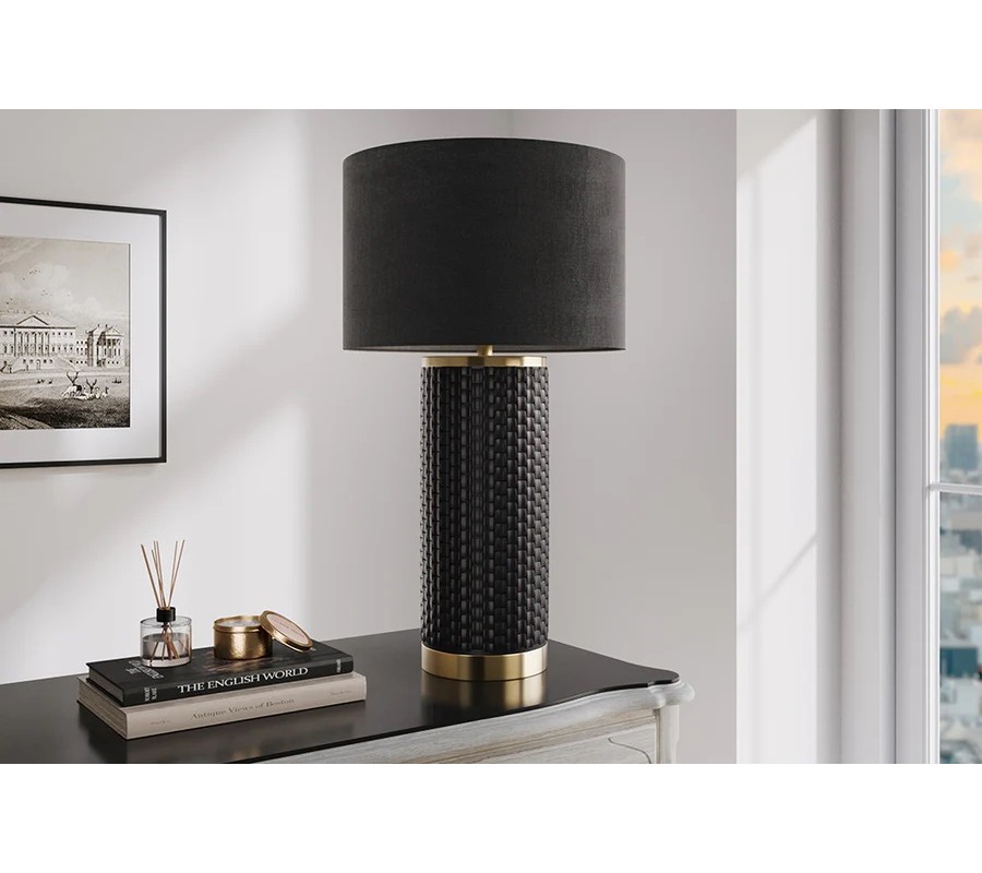Designová art deco černá stolní lampa Draconia s keramickou podstavou s reliéfním čtvercovým vzorem a zlatými detaily 70 cm