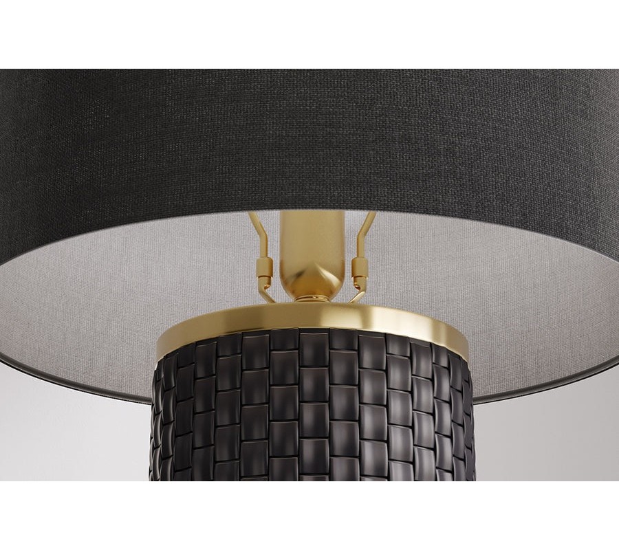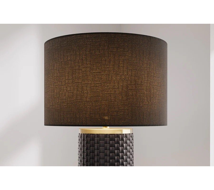 Lampa má válcovitou nohu vyrobenou z keramiky v černé barvě. Zdobí ji geometrický reliéf ze čtvercových prvků, který připomíná překrývající se šupiny. Každý segment je detailně tvarován, s vyvýšenými okraji a prohnutou střední částí. Povrch tak působí plastickým dojmem a při zažnutí světla vytváří efektní stínohru.