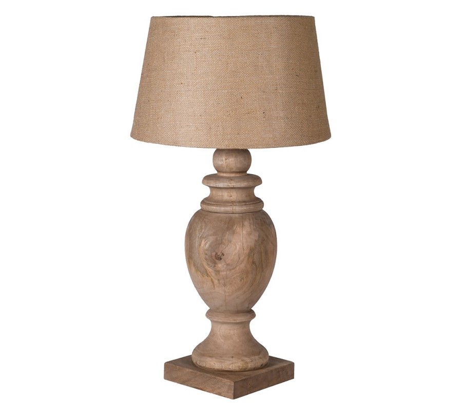 Dominantním prvkem lampy je noha z mangového dřeva, precizně tvarovaná do podoby klasické vázy. Plynulé oblé linie se jemně rozšiřují a zužují, čímž vytvářejí plastický, sochařský efekt s vyváženými proporcemi. Povrch dřeva si zachovává přirozenou kresbu, jemné barevné přechody a drobné nepravidelnosti typické pro masivní přírodní materiál, díky čemuž každý kus působí originálně. Noha je ukotvena napevné čtvercové podstavě, která zajišťuje stabilitu a zároveň vizuálně vyvažuje celkový tvar lampy.
