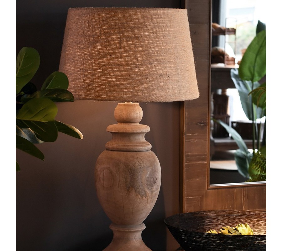 Venkovská stolní lampa Eriza z mangového hnědého dřeva s vyřezávanou nohou a válcovým stínítkem z juty 93 cm