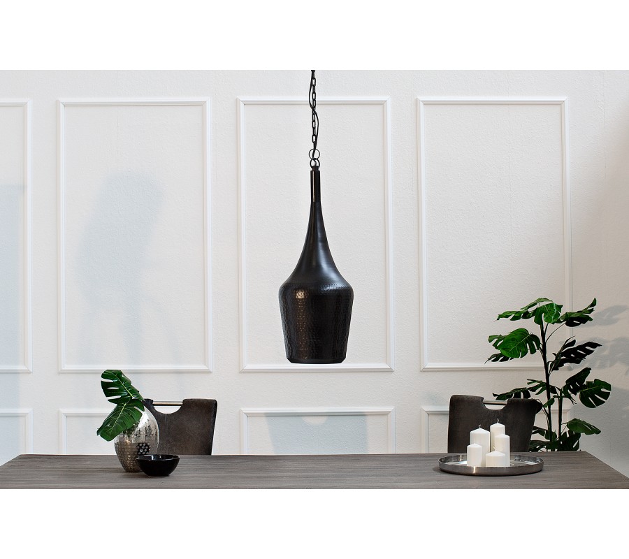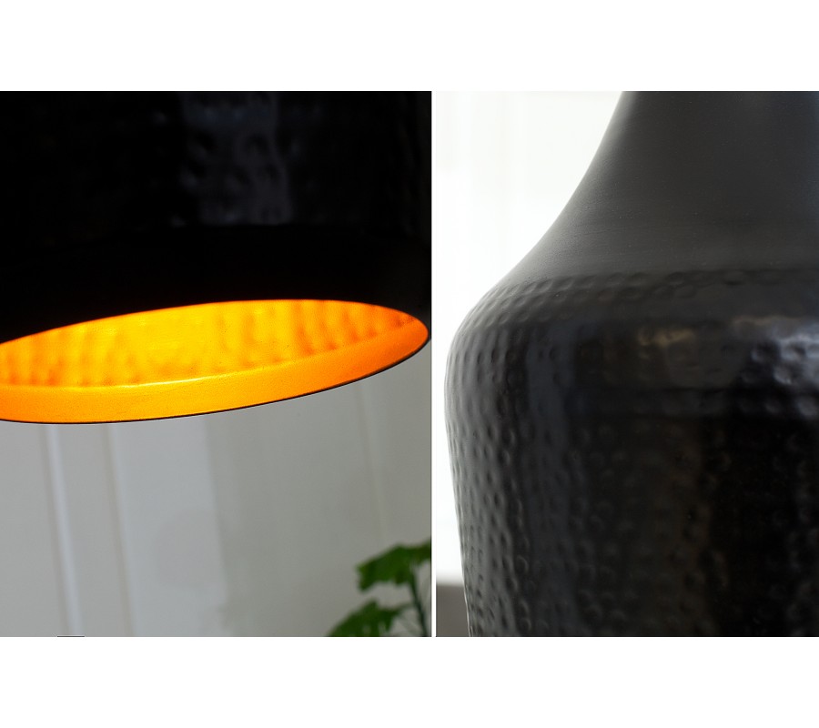 Designová závěsná lampa s černou a měděnou vnitřní barvou je skvělým kouskem do moderně nebo industriální zařízených interiérů. Má stylové propracované zavěšení v podobě řetězů. Svým nerovným povrchem vzniká originální a designový kousek do Vaší domácnosti. Je atypického tvaru a velmi se hodí jako lampa zavěšená nad masivním jídelním stolem. Vnitřní barva je měděná, která krásně září při spuštění světla, a tím osvětluje místnost krásnými teplými barvami. Je vyrobena z kovu a mosazi.
