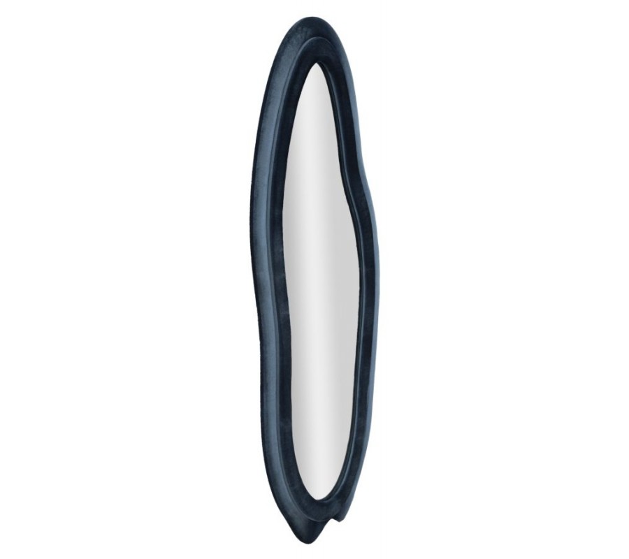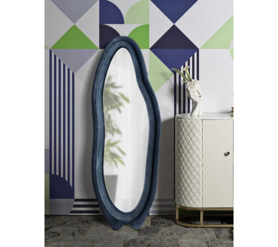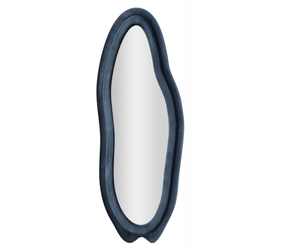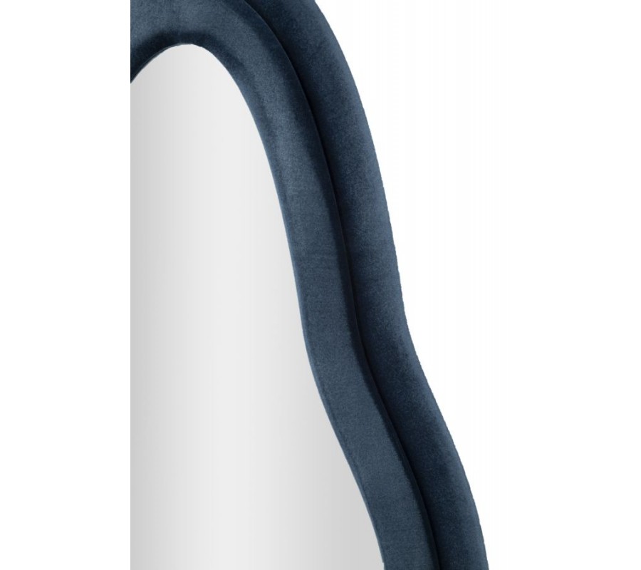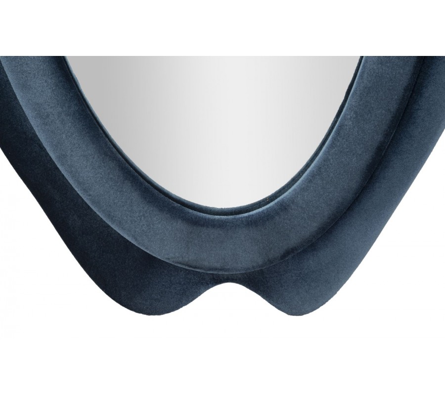 Zrcadlo Wavey je výrazným designovým kouskem s originálním a nápaditým asymetrickým vlnitým tvarem, který působí organicky, jako by byl inspirován tvarem vody nebo přírodními liniemi. Rám zrcadla je potažen modrým semišovým potahem se sametovým leskem, který dodává celému objektu luxusní, ale zároveň měkký a příjemně působící vzhled.