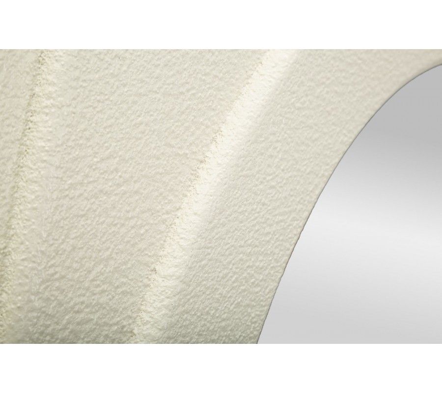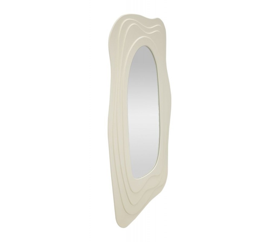 Zrcadlo Landa upoutá svým organickým asymetrickým tvarem a vrstveným rámem s vlnitým designem, který připomíná přirozené linie reliéfu nebo plynulý pohyb vody. Zrcadlová plocha je oválná, jemně zapuštěná do rámu, což zvýrazňuje její centrální polohu a zvyšuje estetický dojem. Povrch rámu má jemně strukturovaný nátěr, který zvyšuje vizuální hloubku a zároveň dodává zrcadlu řemeslný charakter.