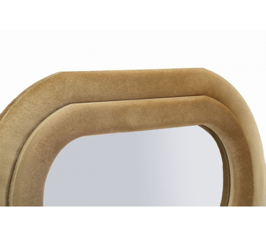 Zrcadlo Swan přináší do interiéru harmonickou kombinaci měkkých křivek, příjemného materiálu a funkčního designu. Jeho obdélníkový formát je ozvláštněn plynulým vlnitým obrysem, který působí dynamicky a zároveň elegantně. Dvojitý rám je potažen jemným sametovým potahem v béžové barvě, která působí měkce, teplo a decentně. Stejný potah se nachází také na zadní straně, což zrcadlu dodává dokončený a ucelený vzhled.
