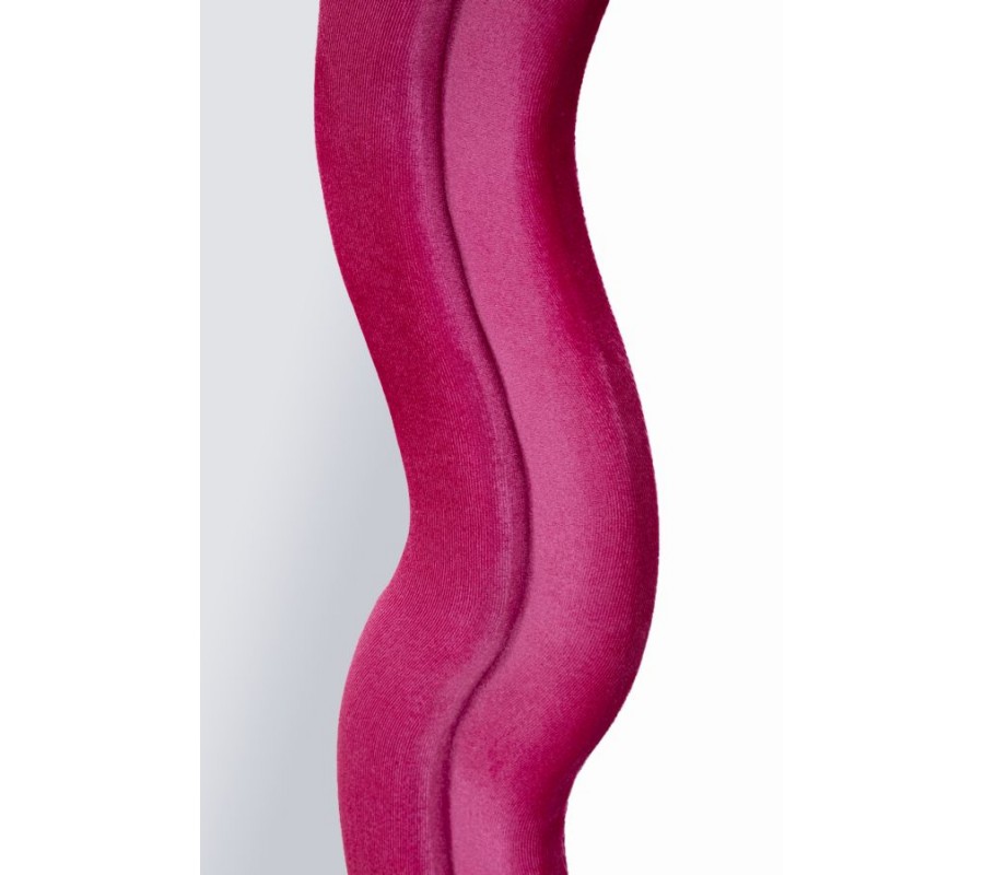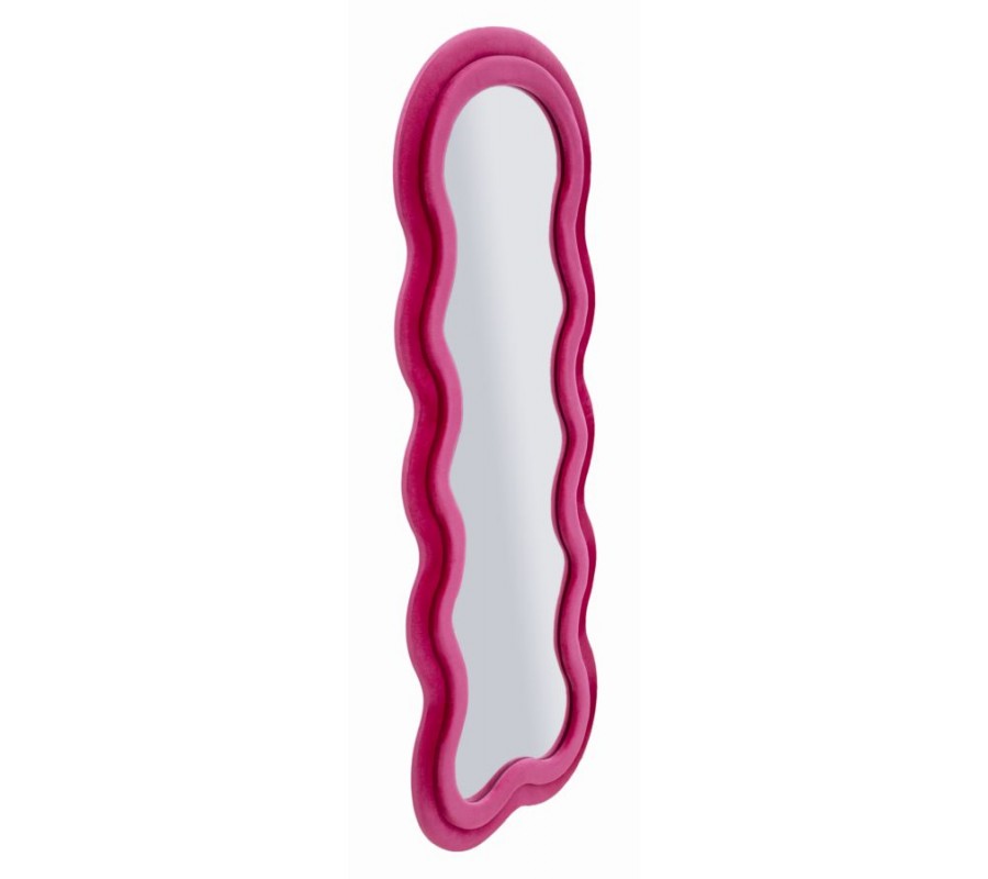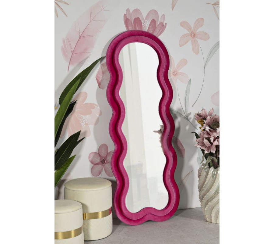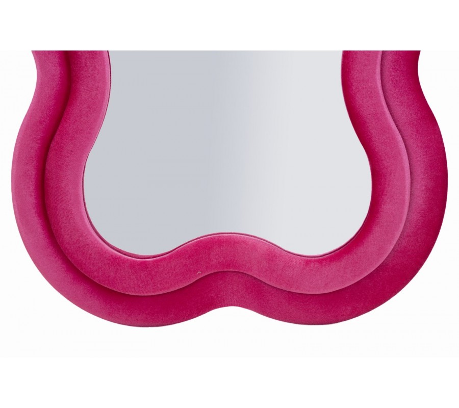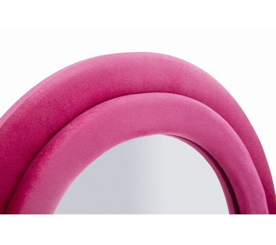 Celý rám je čalouněný růžovým semišově sametovým potahem, který působí měkce, luxusně a dodává zrcadlu elegantní lesk a vizuální hloubku. Jeho konstrukce má dýhovaný povrch, což zaručuje pevnost, stabilitu a kvalitní zpracování, typické pro designový nábytek vyšší třídy.