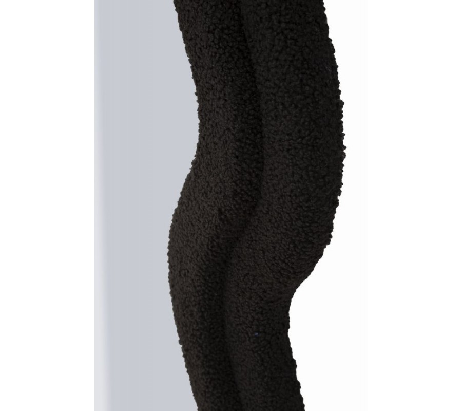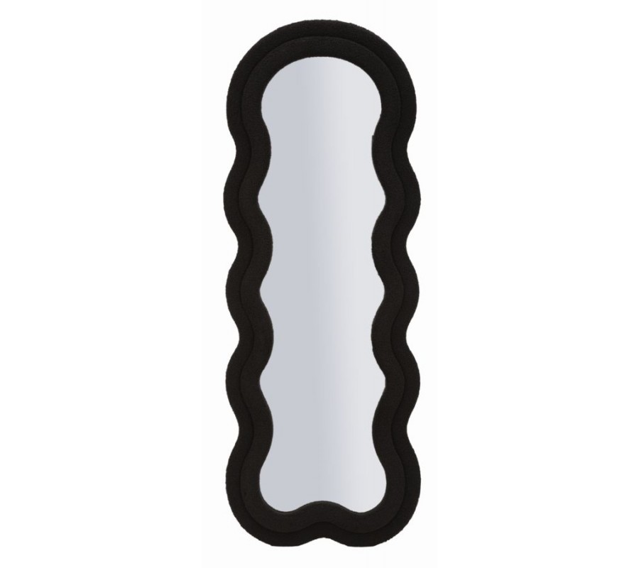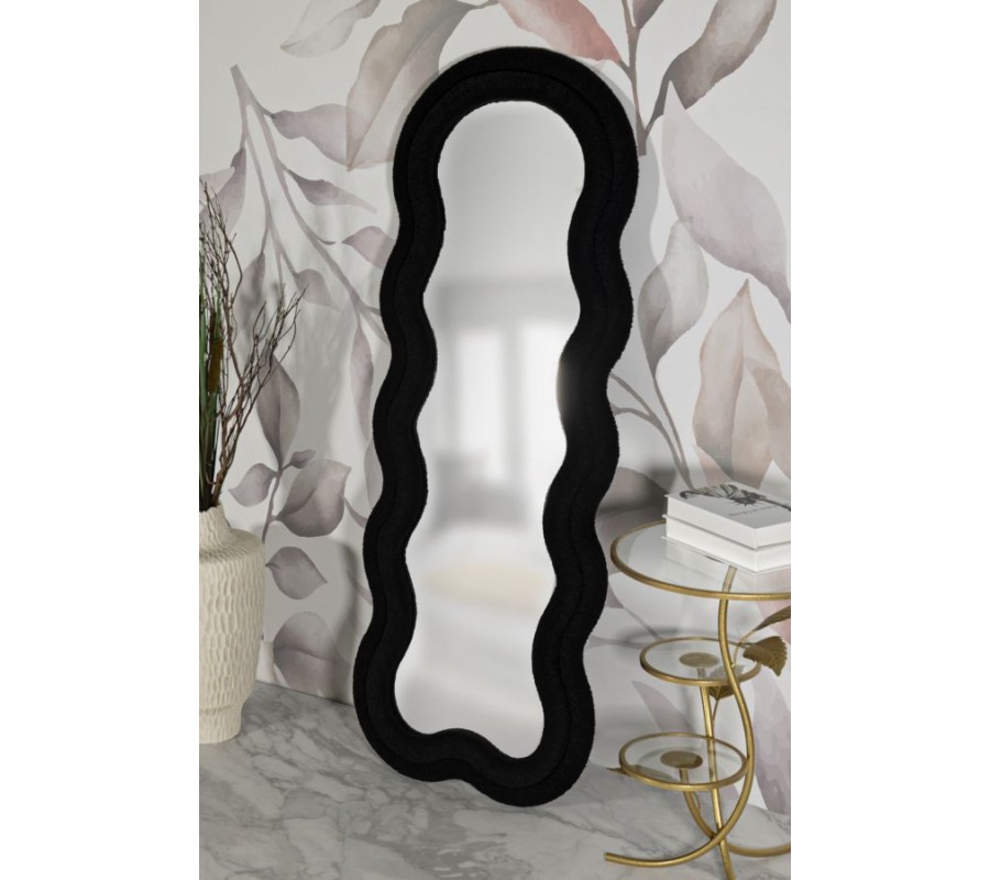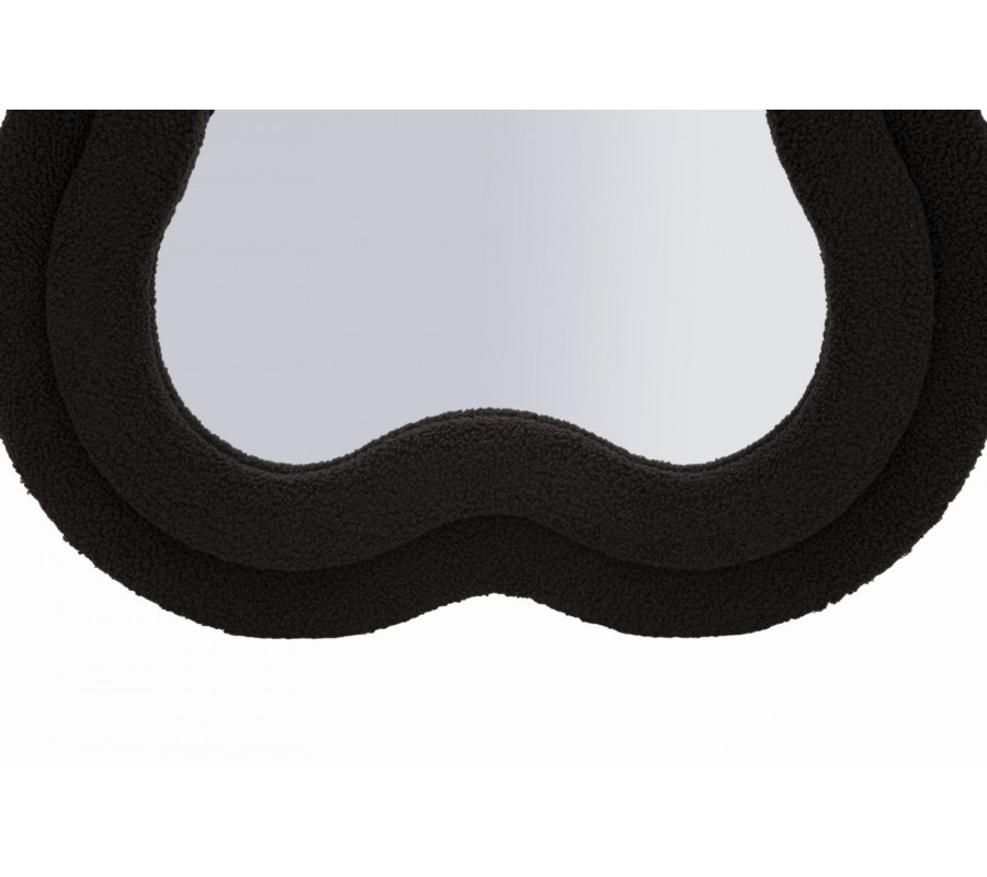 Dvojitý rám zrcadla je potažen kvalitním černým bouclé potahem, který v kombinaci s dynamickým tvarem působí luxusně, dramaticky a elegantně. Potah pokračuje i na zadní stranu rámu, čímž zvýrazňuje precizní zpracování a estetickou hodnotu z každého úhlu pohledu.