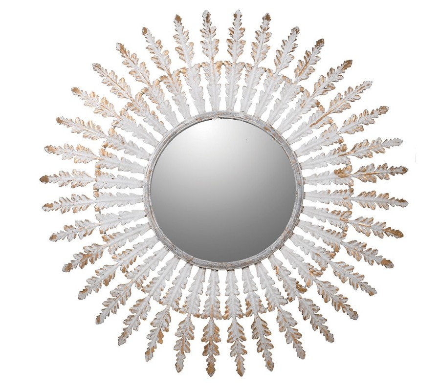 Zrcadlo Soleil je elegantní glamour doplněk s výrazným vintage nádechem, který okamžitě rozzáří každý interiér. Jeho kulatý tvar symbolizuje slunce, přičemž rám složený z ornamentálních kovových paprsků v bílé barvě se zlatou patinou vytváří nádherný dekorativní efekt. Zrcadlo působí luxusně, ale zároveň jemně a díky ručnímu opracování získává originální umělecký charakter.