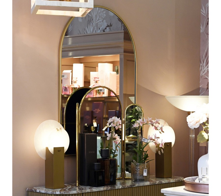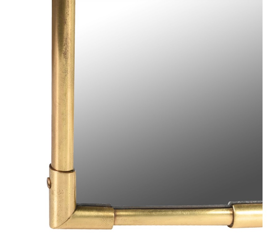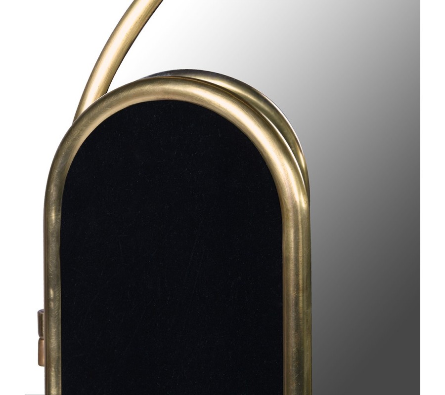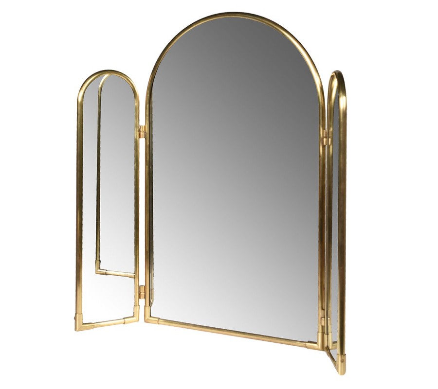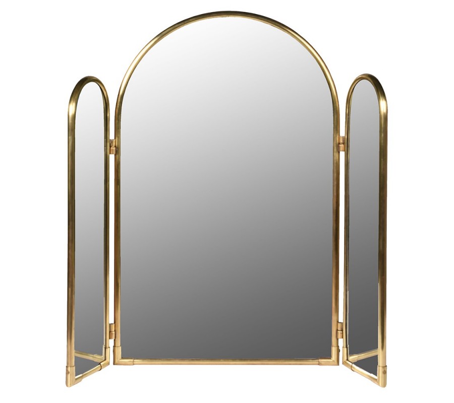 Zrcadlo je složeno z tří panelů. Každý je ohraničen rámem z kovu ve zlaté barvě s válcovitým tvarováním, které podtrhne elegantní zaoblení. Vyšší střední panel má šířku 46 cm a spodní obdélníkový rám doplňuje oblouk ve vrchní části.