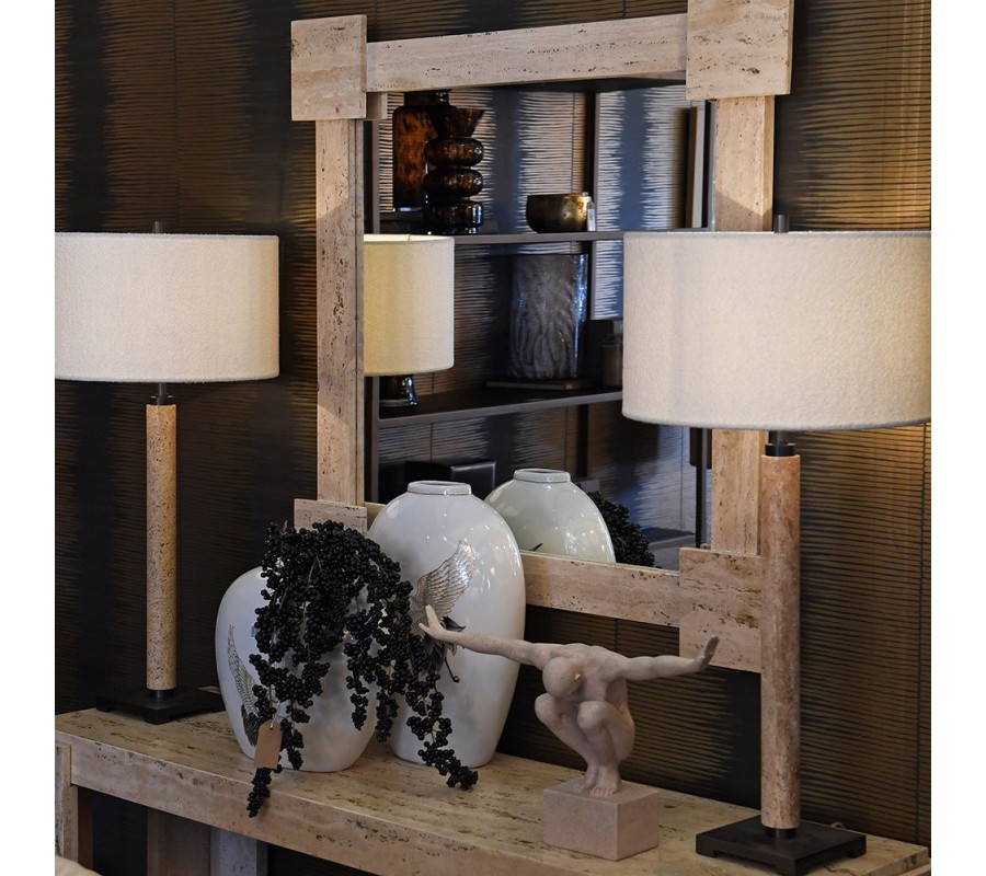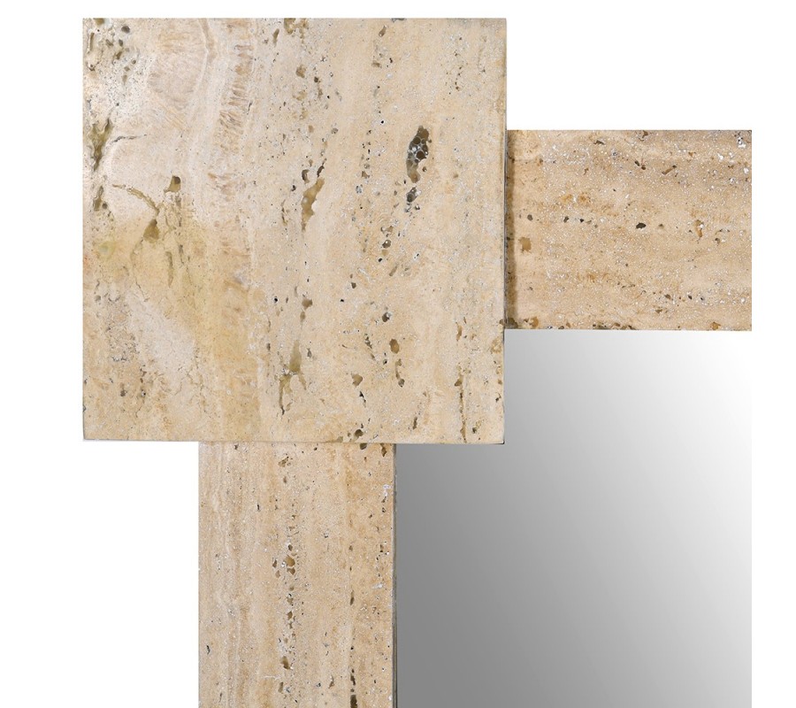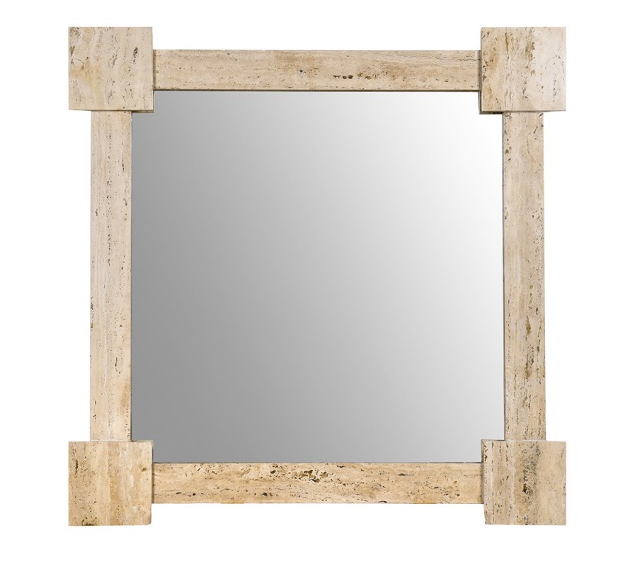 Luxusní nástěnné zrcadlo Caldera představuje harmonické spojení architektonické preciznosti, nadčasového designu a ušlechtilosti přírodního kamene. Čtvercové zrcadlo je orámováno masivním travertinovým mramorovým rámem v jemném krémovém odstínu, který působí elegantně, klidně a mimořádně sofistikovaně. Každý roh rámu je zvýrazněn samostatným čtvercovým blokem travertinu, přičemž po celém obvodu jsou tyto prvky propojeny travertinovými deskami, čímž vzniká výrazná geometrická kompozice s architektonickým charakterem. Přirozená struktura travertinu s jemnými póry, barevnými přechody a kresbou kamene dělá z každého kusu jedinečný originál a dodává zrcadlu autentický luxusní výraz. Ze zadní strany je zrcadlo vyztužené dýhovaným dřevem, které zvyšuje jeho stabilitu, pevnost a kvalitu zpracování.