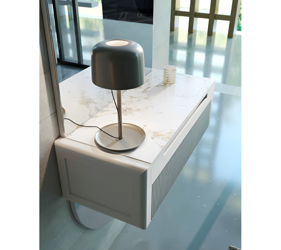 Vrchní deska zásuvky má mramorový design s bílým podkladem a zlatými žilkami, který působí luxusně a elegantně. Povrch je hladký a vizuálně jemně lesklý, čímž vytváří kontrast k matnému dřevěnému povrchu. Celkový dojem doplňují hladké a jemně zaoblené hrany, které zvyšují estetický i uživatelský komfort.