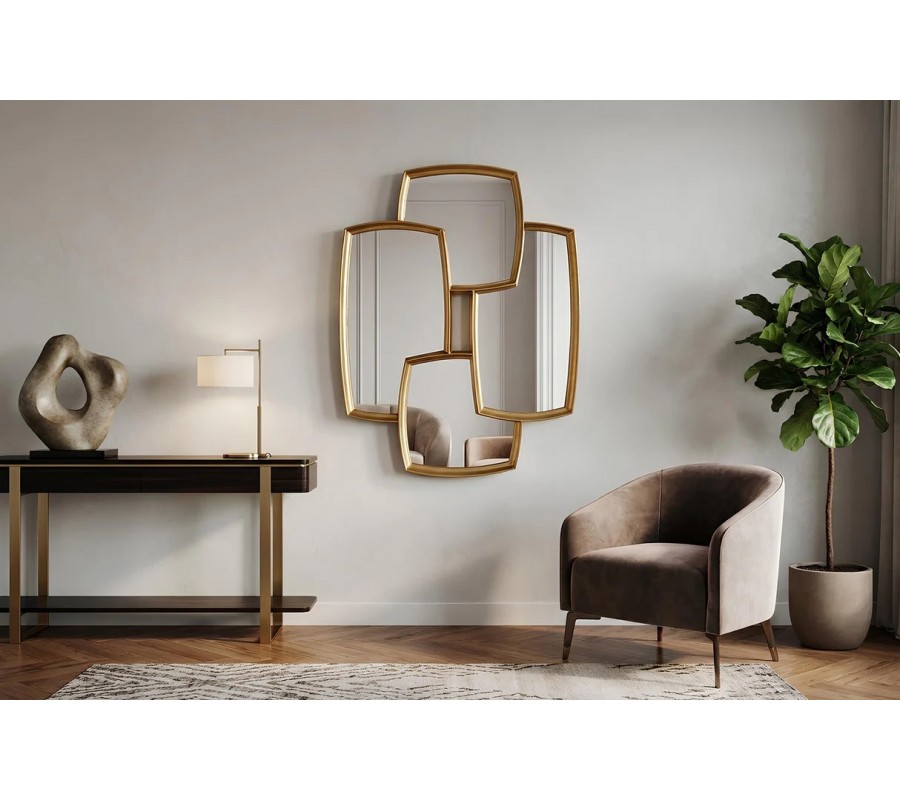 Glamour nástěnné zrcadlo Mijak je originální designový prvek, který v interiéru působí jako výrazný dekorativní objekt. Zrcadlo je tvořeno čtyřmi obdélníkovými plochami, které se navzájem překrývají a vytvářejí zajímavou, atypickou kompozici s moderním uměleckým výrazem. Každá část je lemována plastickým rámem z pryskyřice v elegantním zlatém provedení, precizně zpracované detaily. Díky použití pryskyřice je rám lehký, ale zároveň pevný, což zrcadlu dodává vzdušnost a usnadňuje jeho instalaci.