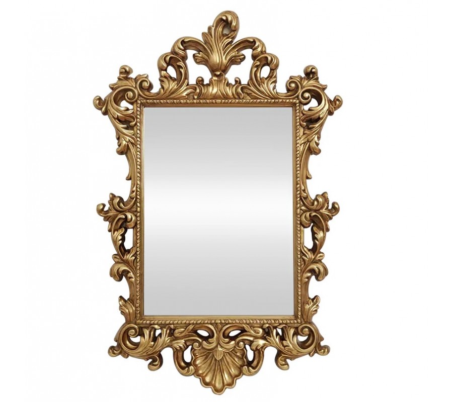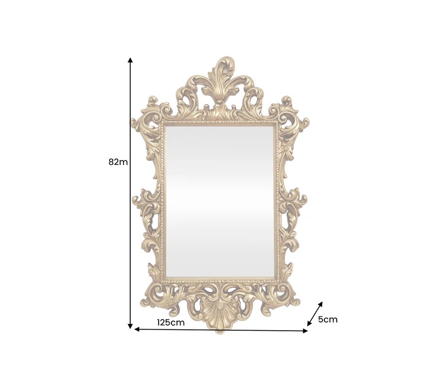 Glamour barokní nástěnné zrcadlo Garin je výrazný luxusní doplněk, který v interiéru působí jako umělecký solitér. Má obdélníkový tvar a bohatě zdobený zlatý rám s ornamentálními detaily typickými pro barokní styl. Rám je vyroben z umělé pryskyřice, která je lehká, ale zároveň pevná, a umožňuje vytváření komplikovaných plastických tvarů s precizním zpracováním detailů. Díky nižší hmotnosti je zrcadlo praktické pro manipulaci i zavěšení.
