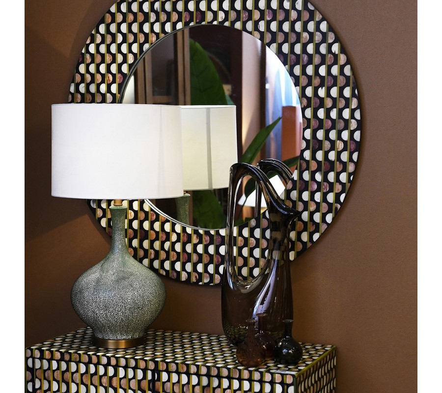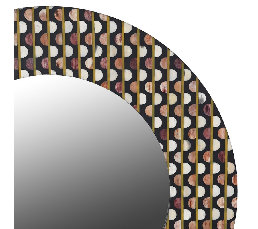 Designové kulaté nástěnné zrcadlo Hajdy je výrazným dekorativním prvkem, který v interiéru okamžitě zaujme svým retro charakterem a precizním řemeslným zpracováním. Rám zrcadla je bohatě zdoben intarzií z buvolí kosti v bílých a hnědých tónech, vytvořenou do pravidelného motivu drobných kroužků. Tento opakující se vzor působí rytmicky a graficky, přičemž jemné barevné přechody dodávají rámu hloubku. Podklad tvoří mangové dřevo v černé barvě, které zvýrazňuje kontrast ornamentů a podtrhuje výrazný design zrcadla. Samotné zrcadlo jevyztuženo dýhovanou deskou, což zajišťuje jeho pevnost, stabilitu a dlouhou životnost.