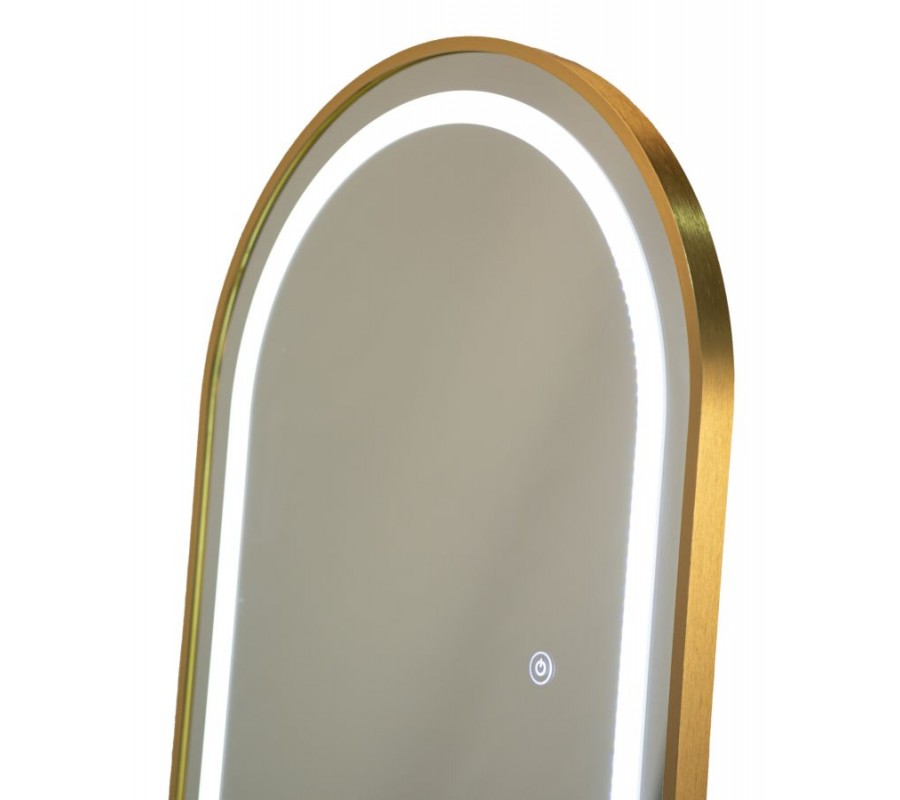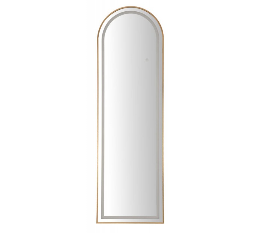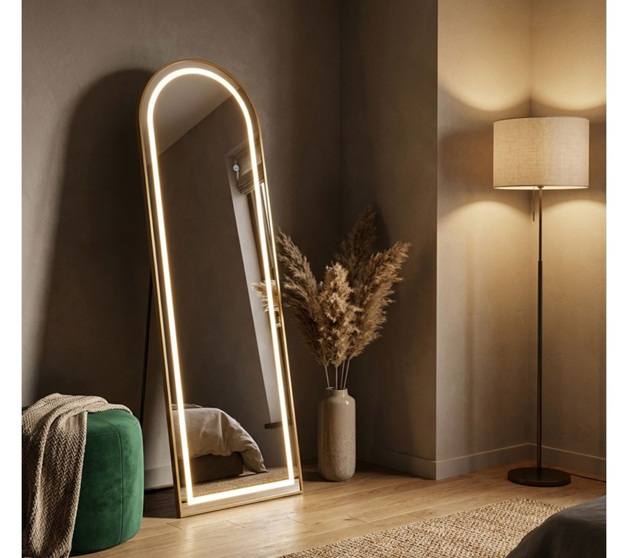 Designové glamour stojící zrcadlo Leanor se zlatým rámem s obloukovou vrchní částí a LED osvětlením 160 cm