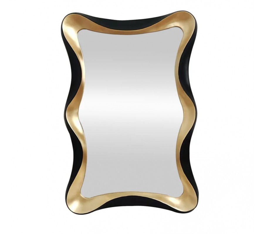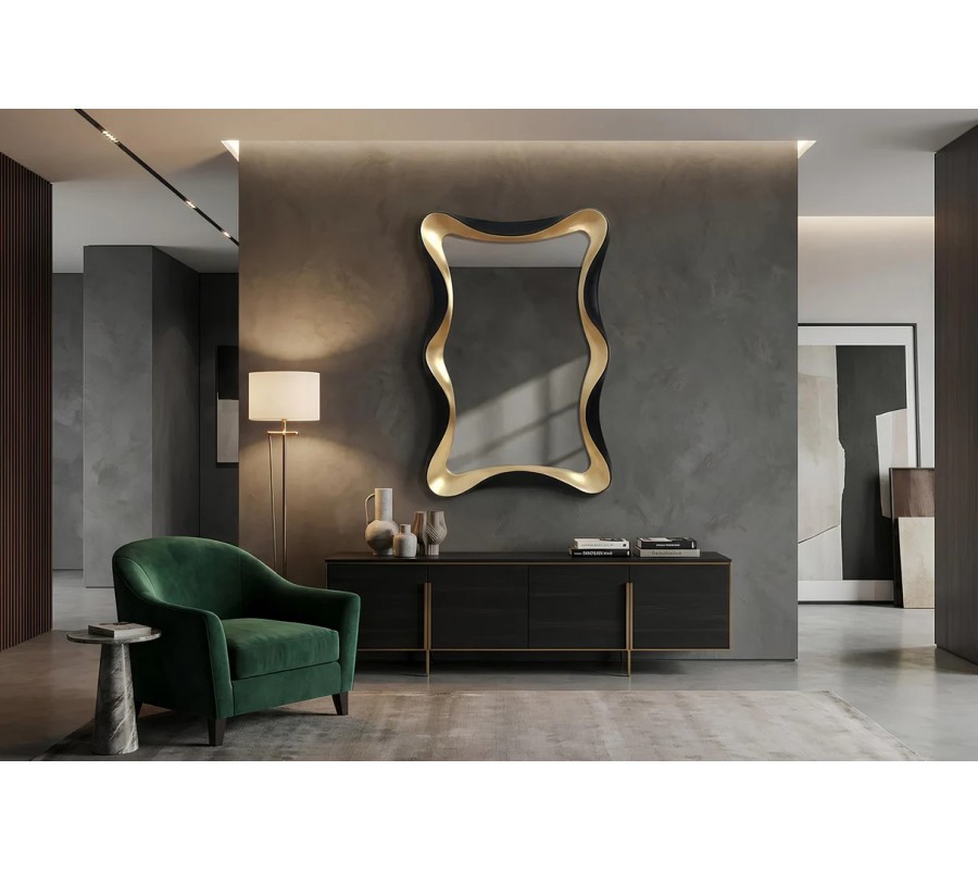 Glamour nástěnné zrcadlo Yraj je výrazný designový doplněk, který v interiéru okamžitě upoutá pozornost. Má obdélníkový tvar s originálním vlnkovitým rámem, jehož vnitřní hrany jsou v luxusním zlatém provedení a vnější hrany v elegantní černé barvě. Tato kontrastní kombinace dodává zrcadlu sofistikovaný glamour charakter s jemným nádechem art deco.