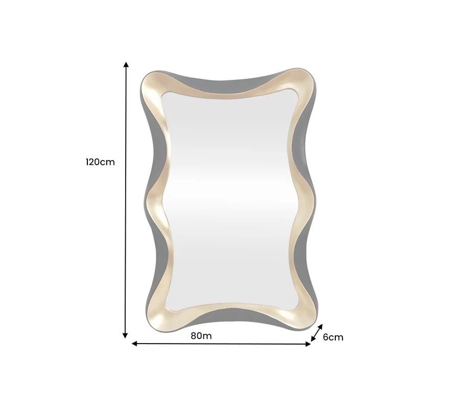 Rám zrcadla je vyroben z kvalitní pryskyřice, která umožňuje precizní tvarování detailů a zároveň činí zrcadlo lehkým, ale pevným. Vlnkovitý design působí plasticky, dekorativně a luxusně, díky čemuž zrcadlo funguje nejen jako praktický prvek, ale také jako výrazná designová dekorace stěny.
